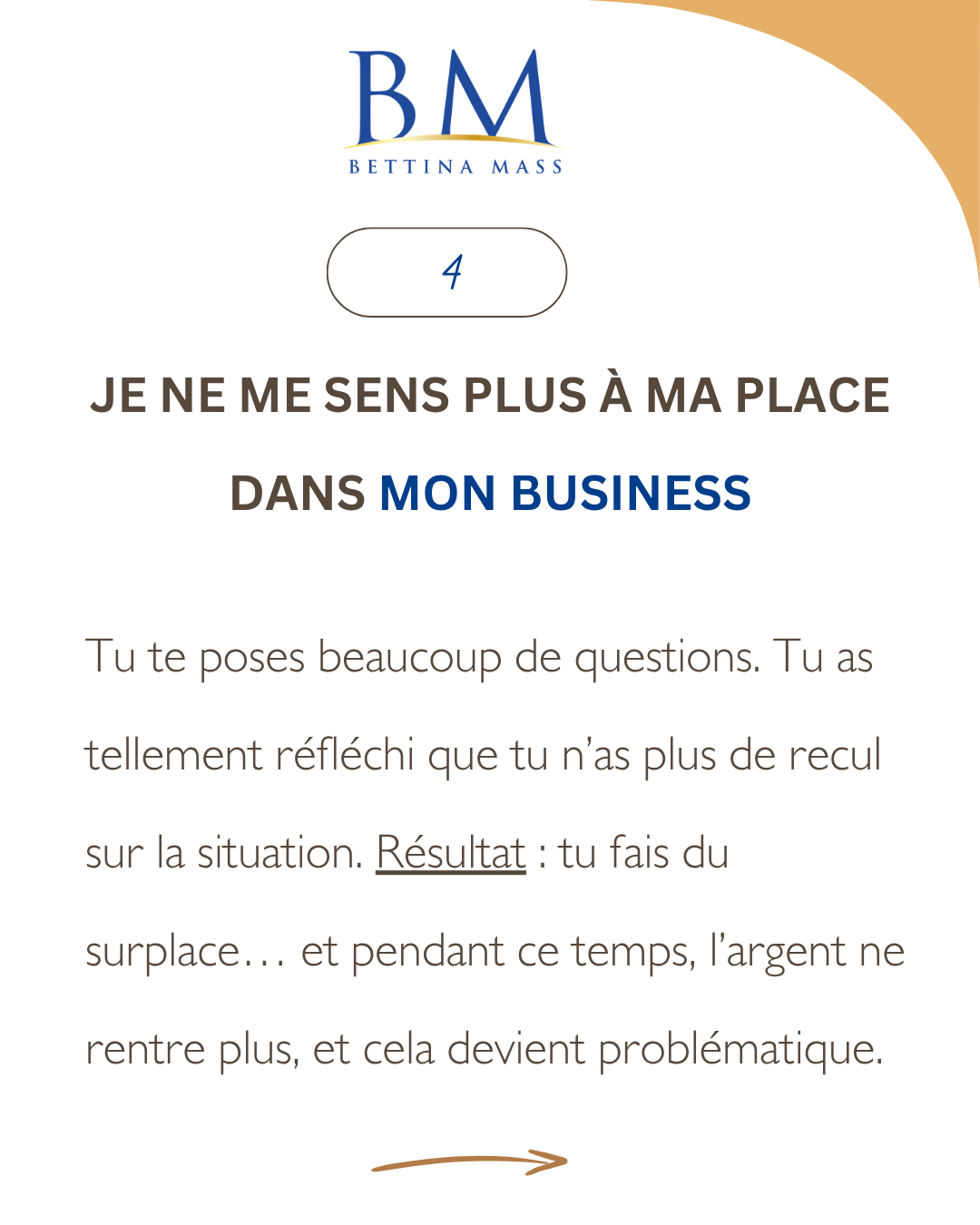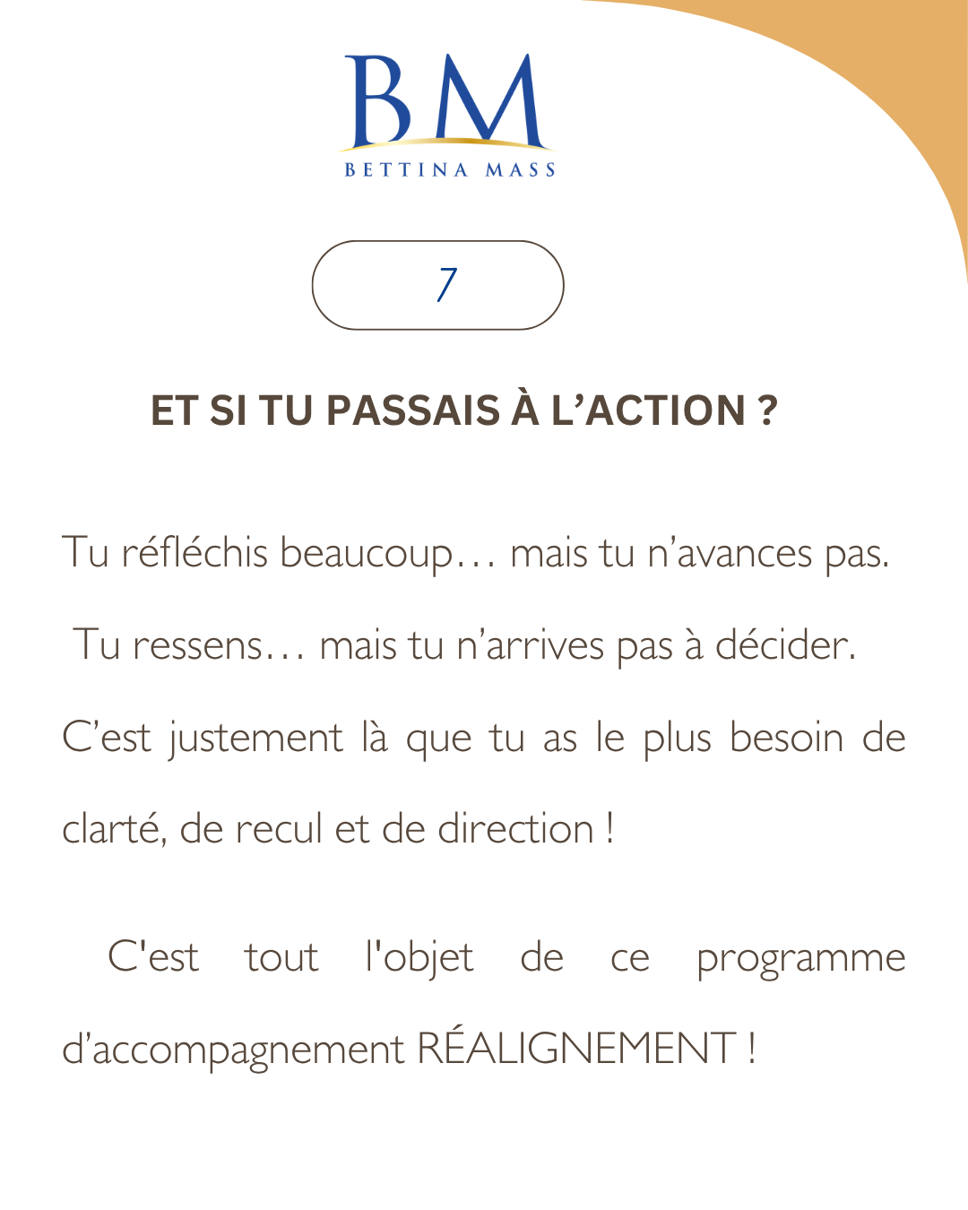 Je m’appelle Bettina Mass, et j’accompagne les âmes audacieuses — entrepreneurs et leaders atypiques, — ceux qui ne rentrent pas dans les cases, habités par une vision, une foi profonde et des rêves pluriels — à remettre de la clarté, de la structure, des bases financières solides et du sens dans leur vie comme dans leur activité.
